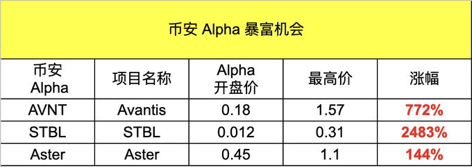 让人意想不到的是,山寨季的风居然是从币安 alpha 刮起来的。 简单总结一下上周来自币安 alpah 的暴富机会: $AVNT @avantisfi Base 链上的衍生品交易所,可以看作是 base 的 aster 投资者包括 Pantera Capital、Founders Fund、Base Fund $STBL @stbl_official 泰达前联合创始人@Reeve_Collins