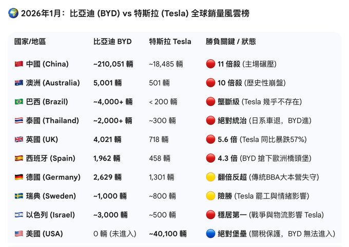 Tesla在全球市场,已全面落后比亚迪,2026年1月数据。 2011年,Elon Musk听说BYD时,感到很好笑…… twitter.com/tiabitcoin/status/...