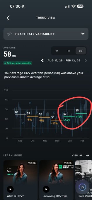 一般来说,HRV 是最难拉升的指标之一,尤其是你已经在中高位的时候,再往上抬基本是硬功夫。但我最近两个月,连续两个月环比 +14%,最近一周平均 77(中间还有两天喝了酒,懂的都懂,酒精对 HRV 是毁灭性打击)。 我做了一件事:把我所有检测报告——血液指标、B超、彩超、体检数据、补剂清单——全部结构化后喂给 AI,让它基于真实数据重做我的补给方案。结果是:删掉一堆没必要的,加了一些真正针对我指标的,两个月执行下来,HRV 直接给反馈。 更有意思的是,我甚至没用什么“医疗专用大模型”,就用 ChatGPT 和 Gemini。对比下来,我更偏向前者,逻辑更完整,解释更细,推演链条更清晰。 说实话,这个效果把我自己都震住了。不是那种“感觉好一点”,而是数据级别的改善。 如果 AI 能把个体健康优化做到这种程度,人类平均寿命往 100 岁走,真不是科幻。