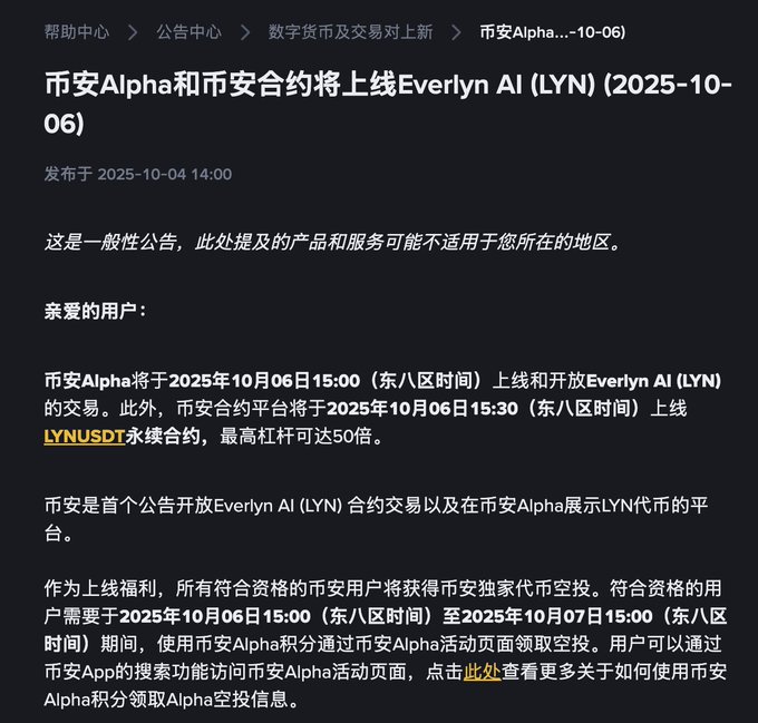 Binance Alpha:10月6日15:00(UTC+8)