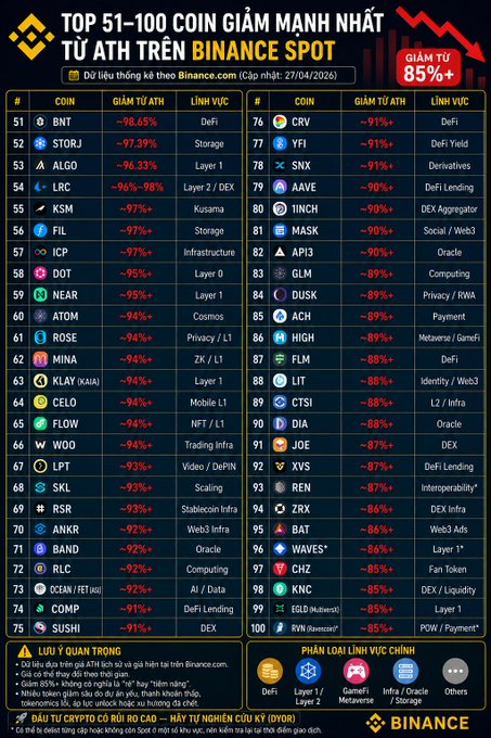 如果你足够幸运,没有持有“价格从历史最高点下降99%的币种”,那么图中其他50种价格大幅下降的币种也可能会让你感到沮丧。这些币种包括尖端科技公司、融资数亿美元的独角兽企业等等…… 我也遇到这种情况了?你们也遇到这种情况吗? twitter.com/henvaibta/status/2...