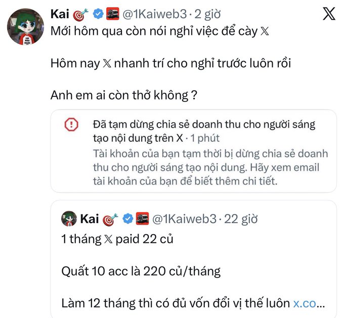 从老板@elonmusk 拿到钱不容易!昨天我还在下面那条关于2200万越南盾的贴文下留言了。现在这个人已经被封号了。 我之前写过,突然间赚到很多钱,炫耀一番,再加上嫉妒,越南网游真是太棒了。所以,如果你只是注册帐号,买些高级道具,然后做交叉推广,这种模式已经不再有利可图了。 如果你想在食品产业取得成功,你需要制作更具创新性、更永续的产品,并更专注于打造你的个人品牌。 (一个月内突然从 50 美元涨到 500 美元很容易引起强烈反弹。)