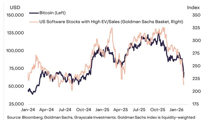 📉BTC在更广泛的市场去风险化过程中与科技股形成镜像 在最近的抛售潮中,比特币的交易与软体和其他成长型股票密切相关,这表明此次回调是由投资组合中普遍的风险规避情绪驱动的,而不是加密货币特有的压力。