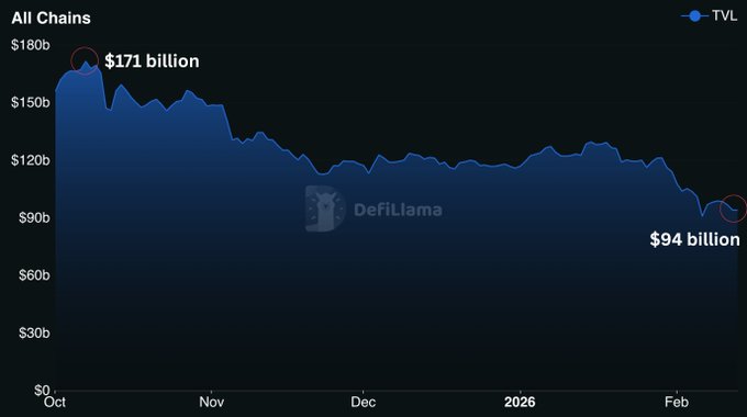 🚨重磅消息:DeFi总锁定价值较2025年10月高点下跌约45%。 DeFi总锁定价值目前为940亿美元,低于10月份的1710亿美元。