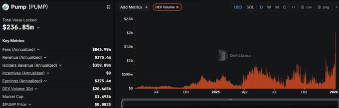 据DefiLlama显示,随着Solana Meme近期的反弹,PumpFun 的日交易量在 1 月 6 日突破 20 亿美元,其中 PumpSwap 贡献了 19.46 亿美元,创下新纪录。与此同时,PumpFun 已超越 HumidiFi 和Raydium ,成为全球第二大加密货币交易所。