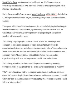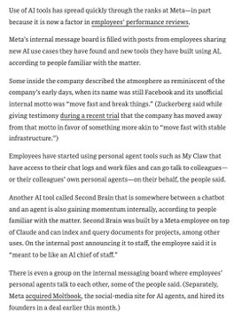 扎克伯格正在为自己打造一个CEO人工智能助手,以辅助他的工作,包括“替他获取那些他通常需要层层上报才能得到的答案”。 Meta公司7.8万名员工的绩效考核现在也包含了人工智能助手的使用情况。 许多员工使用名为My Claw的个人助手,它可以“访问他们的聊天记录和工作文件,并代表他们与同事——或他们同事的个人助手——进行沟通”。 与此同时,有消息称Meta公司正计划裁员1万余人(这与Meta收购人工智能助手初创公司Manus和人工智能助手社交网络Moltbook的举措相吻合)。