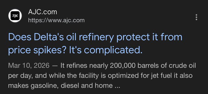 今天才知道,达美航空竟然拥有炼油厂,这大大节省了航空燃油成本: ▫️2012年,达美以1.5亿美元从康菲石油公司手中收购了位于宾州的炼油厂(并斥资1亿美元进行升级改造) ▫️燃油成本占营运成本的20-30%,投资可在5年内收回成本(达美的子公司名为Monroe Energy) ▫️达美是美国唯一一家拥有炼油厂的航空公司 ▫️截至2026年,美国主要航空公司均未进行油价避险…先前避险…先前避险无利可图,现在只能将油价成本转嫁给乘客 ▫️该炼油厂日炼油量达20万桶…其中一半用于生产航空燃油(其余为汽油和柴油,达美将其出售以购买或交换更多航空燃油) ▫️满足达美75%以上的国内燃料需求 ▫️炼油业务仍受周期性波动影响,达美的投资已取得回报一些亏损(例如,在新冠疫情期间,仅在2020年第二季度就亏损了1.4亿美元) ▫️达美航空曾短暂考虑出售炼油业务 ▫️炼油厂近年来再次蓬勃发展:预计2025年销售额将达到50亿美元(约占达美航空总销售额的8%),每加仑航空燃油可节省4美分(约1亿美元的成本节约) ▫️在成品油中,航空燃油利润率最高,且全年需求旺盛(夏季驾车高峰期汽油需求量最大;秋季和冬季柴油需求量最大) ▫️自伊朗战争以来,航空燃油裂解价差(原油与成品油之间的价格差)大幅上涨,炼油业务在可预见的未来仍将保持这一优势 *** AJC:ajc.com/business/2026/03/does-...… 纽约时报2020年文章:nytimes.com/2020/08/10/busines...…