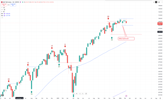 股市第12周,正处于周期中期。 目前仍看涨,并持有部位,因为主要趋势依然存在。只要2月5日的低点没有被突破,就应该继续看涨。 但对7000美元关卡屡次突破失败感到担忧。突破时间越长,形成圆顶的可能性就越大。