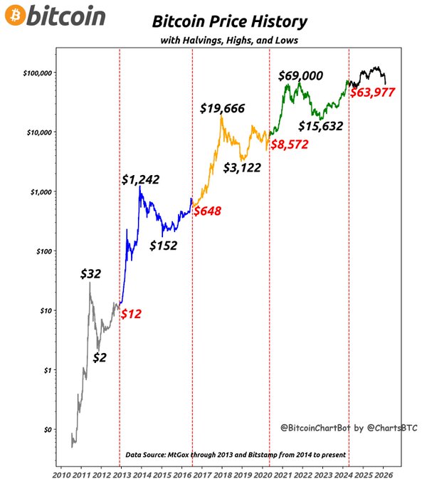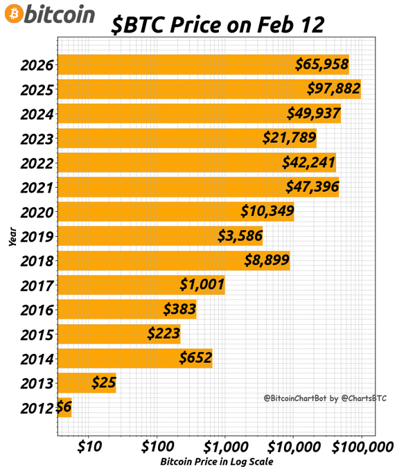 比特币最新价格(2026年2月12日):66,035美元 #价格历史 #高低减半 $BTC #比特币图表机器人
