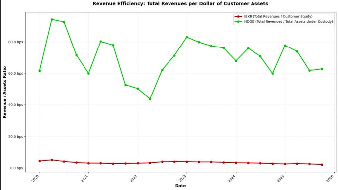 Robinhood 和 IBKR 本质上是相同的业务,但其中一组用户对价格的敏感度低于另一组。 如果股票年均回报率约为 8%,那么每年 50-100 个基点的平台使用费是可以接受的,但如果引入体育博彩,最终结果会是…… twitter.com/TraderNoah/status/...