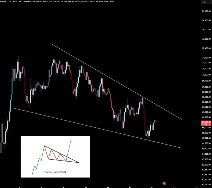 比特币目前呈现小型下降楔形形态,但多头能否找到突破口? 你怎么看?