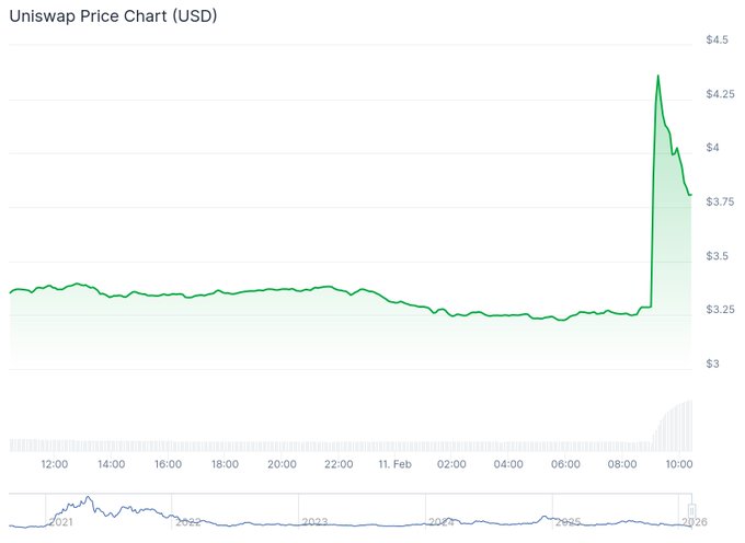 UNI今早飙涨30%,成为大型股中涨幅最大的股票。 受Uniswap和 @Securitize 宣布与 @BlackRock 建立新的合作伙伴关系的消息提振,该代币价格上涨。 详情:thedefiant.io/news/defi/uni-ra...…