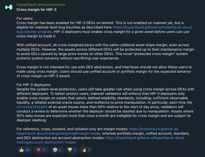 HIP-3 的全仓即将到来 过去几个月,我与多家大型流动性提供商交流过,他们由于逐仓资本效率的限制,一直没有向HIP-3市场提供流动性。希望此次升级能够使HIP-3顶级市场的流动性提升一个数量级甚至更多(假设部署方能够持续增加交易流量)。现在,部署方需要继续寻找新的市场进行拓展。