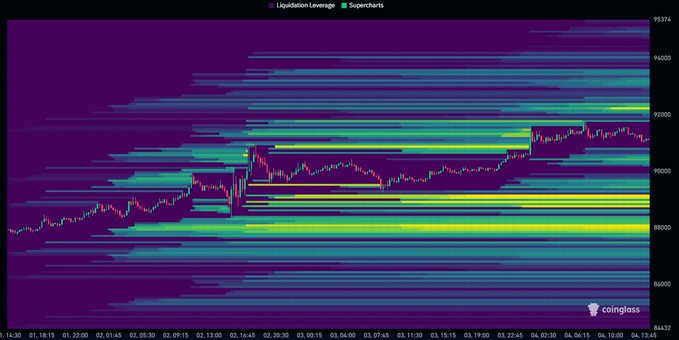 $BTC 最大的流动性聚集区位于年内开盘价下方约 8.8 万美元区域。 上方,9.2 万美元水平值得关注,该水平也与近期以来的区间高点大致相符。
