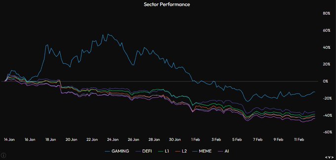 加密货币市场的大部分板块都呈现下跌趋势,几乎一致。 有趣的是,游戏板块是个例外。 这主要是因为这些代币在一月中旬经历了一波不错的上涨行情,但即便如此,其中一些代币的走势依然强劲。 目前还没有什么特别值得关注的,但如果市场出现反弹,值得密切关注。