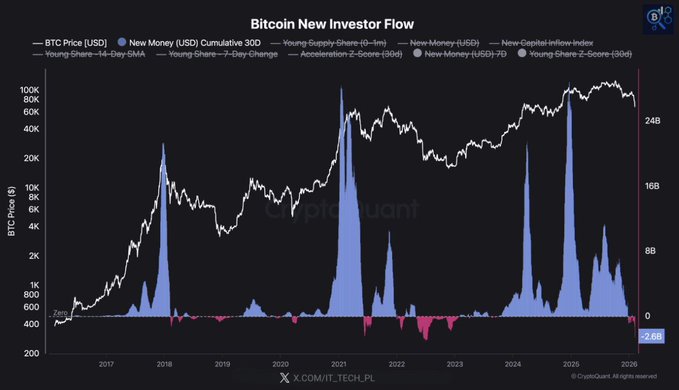 CryptoQuant 最新分析👇 新增资金已转为负值。抛售并未被吸收,反而引发了撤资。 在多头市场中,下跌会吸引买家。在熊市初期,疲软会吓跑买家。 完整分析连结如下。 ⤵️ twitter.com/IT_Tech_PL/status/...