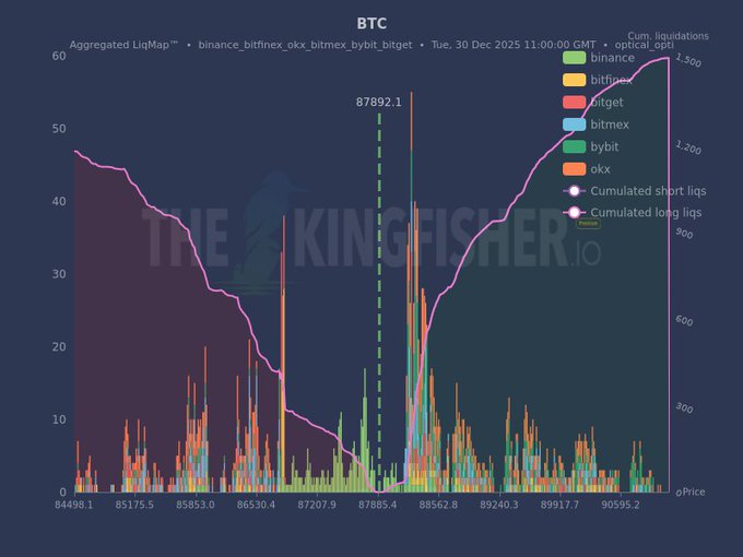 比特币:高杠杆正在累积潜在的清算风险。 下图显示了目前最大的交易集群所在位置👇