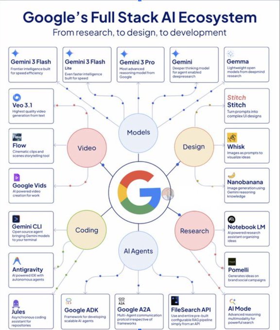我的天哪——有了谷歌AI工具,你简直无所不能。 设计、深度研究、智能体工作流程——真的无所不能。 为了帮助你快速上手,这里提供一份完整的谷歌AI生态系统速查表: