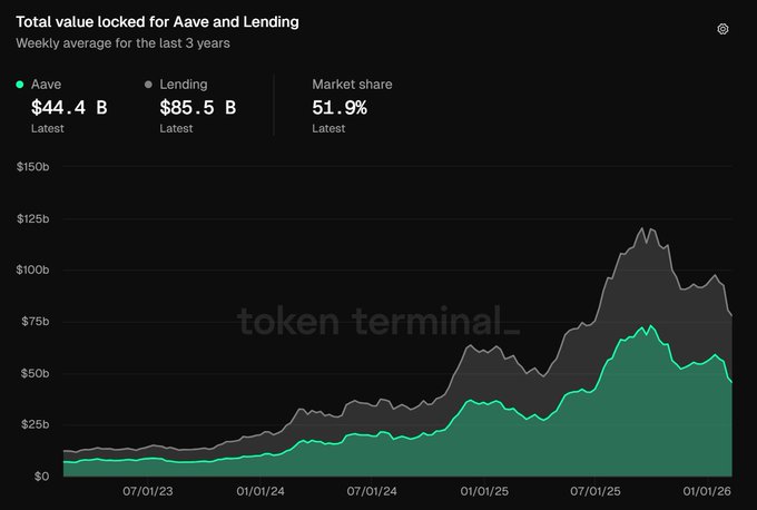 [3] Aave Lending 🏦 尽管自10月10日创纪录的杠杆率暴跌以来, Aave贷款市场规模已从1,200亿美元的高点回落,但仍保持强劲势头。 最新一周平均贷款总额为 850 亿美元 Aave在美国银行业排名中仍排名第 54 位 💪
