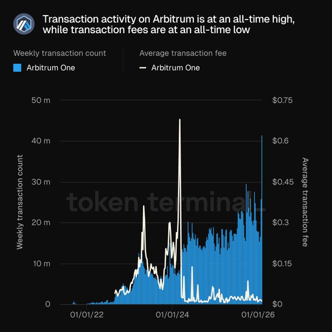 工作成果体现在数据中: Arbitrum上的交易活动达到历史最高水平,而交易费用则处于历史最低水平。 后续进展敬请关注👇 twitter.com/tokenterminal/stat...