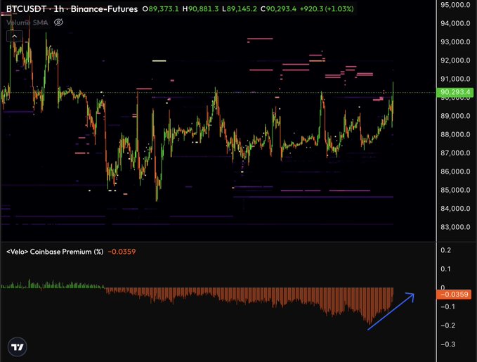 $BTC 我最喜欢的一个市场强弱指标,时隔一个多月终于要从中性转向积极了。 Coinbase溢价在经历了惨烈的12月抛售后,眼看就要转正。 更高的价格马上要来了。