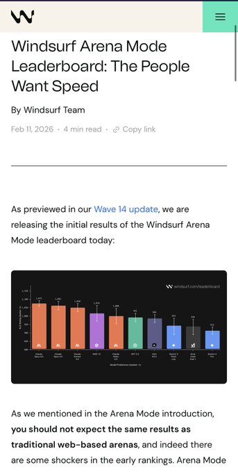 竞技场模式排行榜已出炉! - 第一周获得 4 万张选票(Code Arena 累计获得 14 万张选票) - 首个大规模产品内竞技场 - 第一个不惩罚“速度快但足够好”的竞技场 - 重大冷门: • Gemini 3 Flash 胜过Gemini 3 Pro •@xai Grok Code Fast beat Gemini 3 • Claude Haiku 4.5 胜过 GPT 5.2 •Kimi K2.5 不胜 Sonnet 4.5 •SWE 1.5 击败了克劳德·海库 正如@theodormarcu在查看结果后得出的结论……“人民想要的是速度”。 twitter.com/swyx/status/202170...