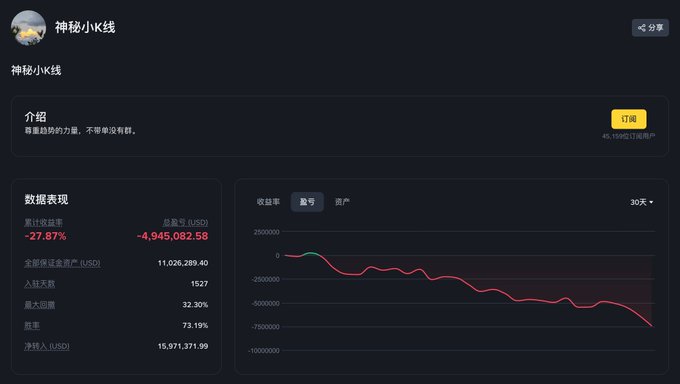 知名 $pippin 空头「神秘小 K 线」还在扛单,账面亏损超 284.3 万美元,还没算上 1 小时收一次的夸张资金费,这部分估计都几百万刀了…🥲 01.02 pippin 曾短时跌至 $0.35 ,今天又反弹到 $0.4883 了,从 2024.11.22 开始已持续了 45 天的操盘,且自 11.30 起大部分时间都是负费率,太磨人了 twitter.com/ai_9684xtpa/status...