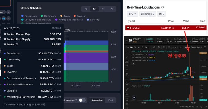 明天解锁,提前一周演戏?😅 短短七天爆拉 2212%, $STO 的庄家有点东西啊 —— 从 $0.08071 最高拉至 $1.86666,又在一小时内爆砸 73%,完成来回收割 🔸明早 8 点,STO 将迎来首次团队和投资人代币解锁,共计 1321 万枚代币,按现价估算为 726.5 万美元 🔹而刚才那波暴跌,爆掉了 Aster 一个价值 767 万美元的空头头寸,$2.55 的爆仓价,拉到 $2.56 精准爆破 这把高端局…瞄准的到底是套保大户,还是追高小散呀?
