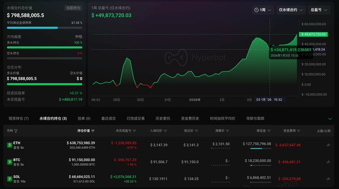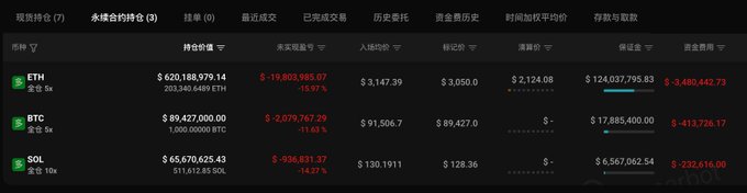 持仓 29 天,「1011 闪崩后开空内幕大佬」的多单又一次水上了,当前浮盈 43.4 万美元😆 ▶︎ ETH:持仓 203,340.64 枚(6.17 亿美元),开仓价 $3,147.39,浮亏 123.8 万美元 ▶︎ BTC:持仓 1000 枚(8986 万美元),开仓价 $91,506.7,浮亏 35.6 万美元 ▶︎ SOL:持仓 51.1 万枚(6603 twitter.com/ai_9684xtpa/status...
