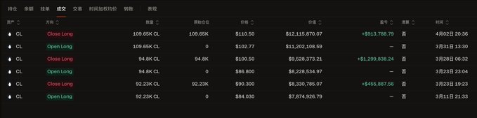 三战三胜!这地狱行情下做多原油竟然能胜率 100%,牛啊🫡 地址 0x7f5…5f47e 昨晚平仓 10.9 万枚 CL 并获利 91.3 万美元,头寸价值 1211 万美元;这已经是本月的第三次做多盈利了,单币已累计盈利超 271 万美元 hyperdash.com/view/0x7f5ff9f8d...…