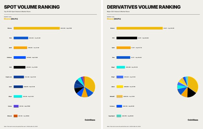 Coinglass Q1 加密报告出来了,四个字总结币安就是「遥遥领先」 ▶︎ 用户资产储备 1529 亿美元,约占主要 CEX 的 73.5% ▶︎ 衍生品交易量 4.9 万亿美元,占前十大交易所的 34.9% ▶︎ 日均 OI 239 亿美元,约占 29.9% ▶︎ 现货交易量 6399 亿美元,市场份额约 34.3% ▶︎ BTC / ETH 期现深度均为 TOP1 报告全文 👉 coinglass.com/en/learn/2026-q1...…
