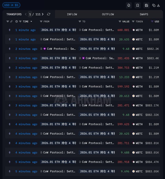 ETH 持仓四年换仓 $WBTC 的巨鲸继续加码! 过去五分钟他又将 4013 $ETH 换为了 138.04 WBTC,价值 1259 万美元,WBTC 成本 $91117.55;昨天起已累计抛售 18159.4 WETH,建仓了 631.78 WBTC,总价值高达 5680 万美元 钱包地址 intel.arkm.com/explorer/addres...… 本文由 #Gate 大门交易所 | @Gate_zh 赞助 twitter.com/ai_9684xtpa/status...