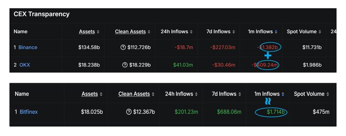 好家伙,fud币安以后,今天又开始fud欧易了。 其实最近1个月,币安欧易都是净流出,而这两个华人创建的平台的净流出加起来,刚好和Bitfinex净流入差不多。 twitter.com/blockTVBee/status/...