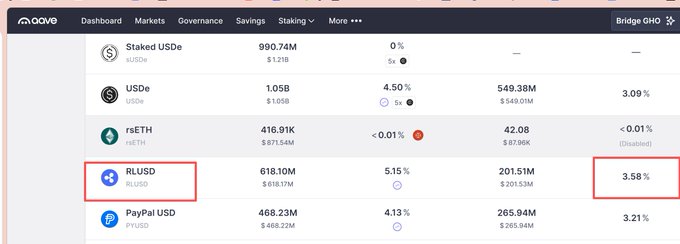 发现了套利的空间! 在AAVE借RLUSD的利率只有3.58%,存到doppler里收益率是7~11%、还有积分、以后会有空投。 twitter.com/blockTVBee/status/...