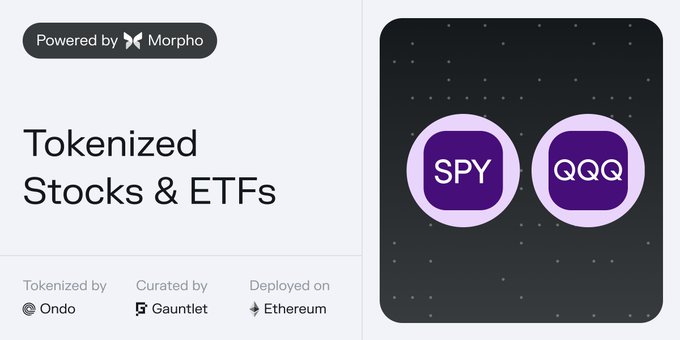 代币化股票现在可以在 Morpho 平台上成为生产性资产。 由 @OndoFinance 代币化的 QQQon 和 SPYon 现在可以抵押在 Morpho 上,借贷流动性由 @gauntlet_xyz 管理的USDC RWA Vault 提供。