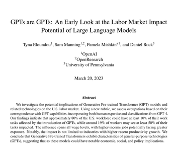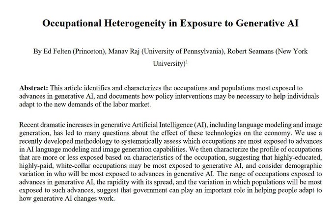值得称赞的是,经济学家们在 2023 年初发表的这两篇论文(作者是 @danielrock、@robseamans 以及其他一些我不确定是否还在 X 工作的人员)出色地预测了哪些工作最有可能受到人工智能的影响(使用 O*NET),而这两篇论文是在 GPT-3.5 时代撰写的。