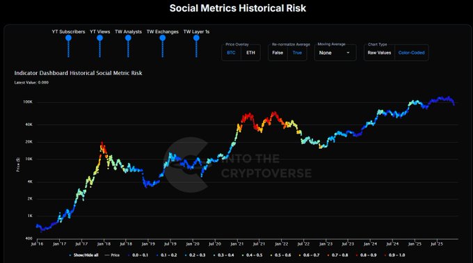 我认为,造成这一轮经济周期如此残酷的主要原因之一可以用一张图表来概括: 零售业再也没有恢复过来。 所有人都在期待类似2021年的山寨币暴涨季,但它始终没有到来。同时,BTC连续三年稳定上涨,而山寨币则一路下跌。 来自 @intocryptoverse 的这张图表显示了社会风险: 蓝色 = 社会兴趣低 红色 = 高度社会关注 而最不可思议的是: 如果BTC真的在10月份达到了约12.6万美元的高峰…那也没人关心。 社会兴趣处于熊市通常出现的水平,而不是牛市狂热的顶峰。