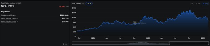 🚨最新消息 DeFi TVL跌破1000亿美元,较10月7日峰值下跌41.8%。 上一次出现如此低的水平还要追溯到2025年5月。 未来形势严峻……