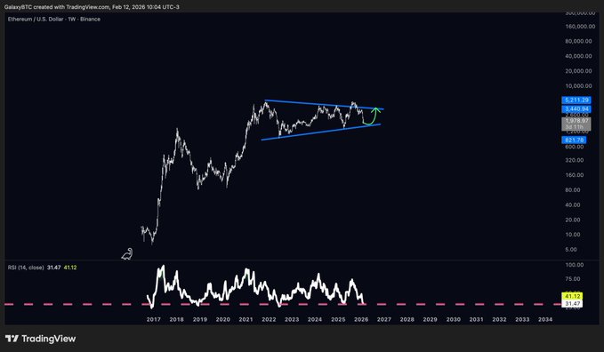 ETH 仍然处在这个巨大的三角形结构里 从这里往上冲到 3500 美元,是接下来最符合逻辑