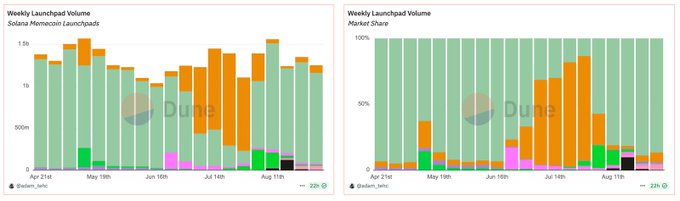 $PUMP 实现了加密货币历史上最伟大的回归。在代币发行量(TGE)之后,它几乎消亡,失去了传奇地位,但现在它再次占据了王者宝座。 6月初 • @pumpdotfun 份额:93.7%(12亿美元) • @bonk_fun 份额:2.6%(3200万美元) 7月下旬 • $PUMP 份额:13.3%(1.47亿美元) • $BONK 份额:79.1%(8.75亿美元) 9月初 • $PUMP 份额:86.5%(11亿美元) • $BONK份额:7.3%(9200 万美元) 衰落原因:http:/Pump.Fun 为何失去主导地位? 1. @bonk_fun 的叙事接管 价值累积与价值提取的讨论占据了主导地位 • $BONK:58% 的费用分配给持有者(50% 回购 + 8% 奖励) • $PUMP:通过 ICO 筹集 6 亿美元 → ICO 资金未回购 2. $PUMP ICO 是一场彻头彻尾的灾难 ICO 在失去关注度的同时,导致 TGE 后资金缓慢流失 • 在主导地位下降期间以 40 亿美元的 FDV 筹集了 6 亿美元 • 联合创始人过去声明:“所有预售都是骗局” 他们是如何实现最大反弹的? 第一阶段:Glass Full Foundation • 向生态系统注入 169 万美元,例如 $HOUSE 34.1 万美元、$TOKABU 33.9 万美元和 $SALARY 17.2 万美元 • $PUMP 上涨 8% 第二阶段:积极回购计划 • 自 7 月 28 日以来,PumpFun 将近 100% 的每日收入用于回购,迄今为止已支出约 6220 万美元(约占供应量的 5%) 第三阶段:创作者激励 • 费用结构:上线时为 1.25%,市值超过 2000 万美元后降至 0.30% • 首日表现:创作者收益增长 10 倍 • 市场反应:$PUMP +14% 市场现状 @heavendex • 100% 收益回购(“上帝飞轮”) • 第一周市场份额达到 9.9%,交易量达到 1.23 亿美元 • 主导地位迄今已降至 0.2% LetsBonk • 7 月下旬 79.1% → 9 月初 7.3% • 在 $PUMP 回购和 Project Ascend 之后失去相关性 • 周交易量:8.75 亿美元 → 9200 万美元 $PUMP 曾跌至 13.3%,这表明 Launchpad 垄断的时代已经结束。$LIGHT 在一周内就达到了 9.9% 的市场份额,创新型竞争对手将不断涌现。 $SOL memecoin launchpad 现已进入多极竞争时代。@pumpdotfun 重夺王位,但如果不创新,就无法保持这一地位。 所有市场份额和交易量数据均由 @adam_tehc 提供 twitter.com/alphanonceStaff/st...