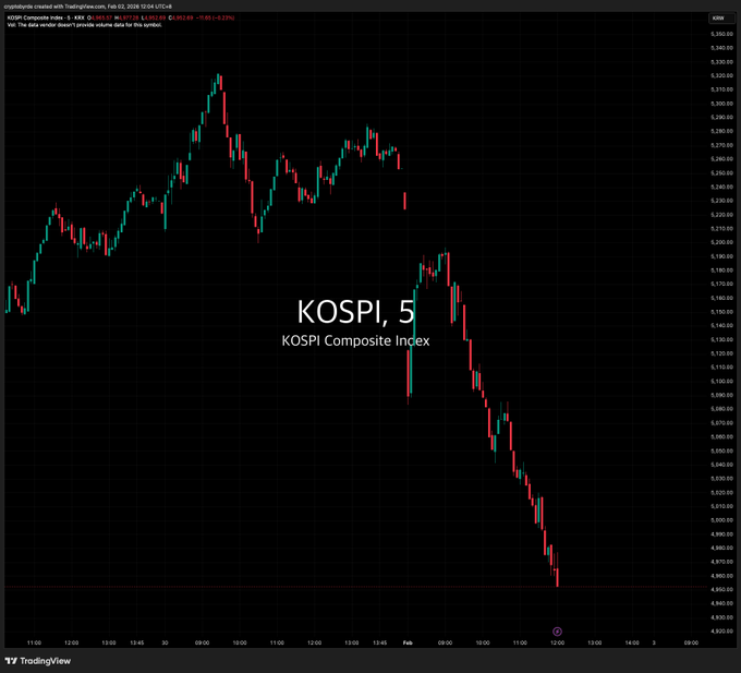韩国综合股价指数-5.1% 韩国综合股价指数200 -5.3% 科斯达克 -4.5% 科斯达克150 -5.9% 市场期待考验沃什和特朗普