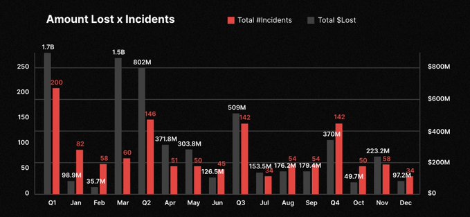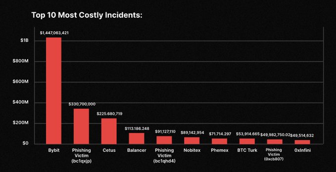 + 仅Bybit一案就占当年总损失的约 43%(约 14 亿至 14.6 亿美元)。