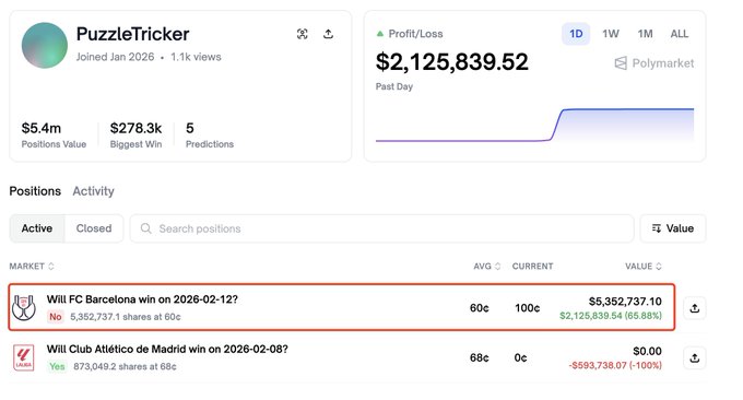 交易员 PuzzleTricker 花费了 323 万美元($USDC)押注巴塞隆纳足球俱乐部将在 2 月 12 日赢得国王杯。 这是一场豪赌。 但他赢了,赚了 212 万美元。 polymarket.com/0x003932bc60524...…