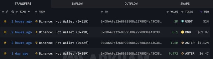 新创建的钱包“0xDD6A”于2小时前从币安提取了160万枚ASTER代币(约合112万美元)。 intel.arkm.com/explorer/addres...…