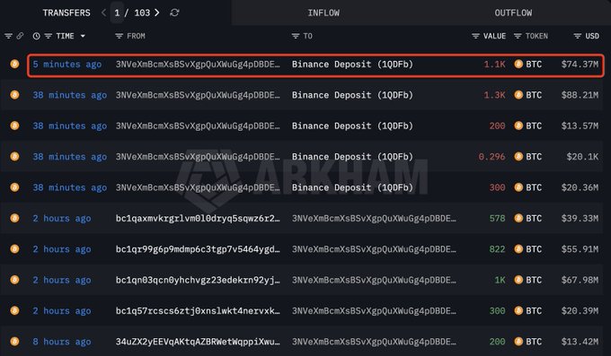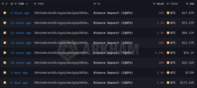 昨天卖出 5,000 枚BTC(价值 3.4256 亿美元)的巨鲸3NVeXm 刚刚又向 #币安 存入了 1,800 枚BTC(价值 1.22 亿美元)。 intel.arkm.com/explorer/addres...… twitter.com/lookonchain/status...