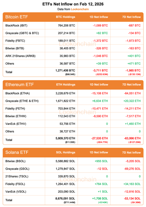 2月12日更新: #比特币ETF: 1日净流量:-3,711BTC(-2.5263亿美元)🔴 7日净流量:-1,985BTC(-1.3512亿美元)🔴 #以太坊 ETF: 1日净流出:-27,535ETH(-5477万美元)🔴 7日净流出:-63,996ETH(-1.2729亿美元)🔴 # Solana ETFs: 1日净流量:+1,708美元SOL(+14万美元)🟢 7天净流出:-53,134美元SOL(-436万美元)🔴 x.com/lookonchain/status/20215...…
