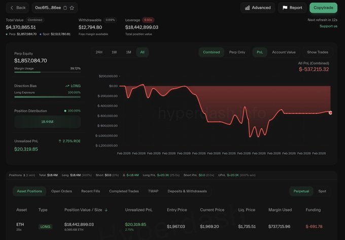 输了。继续努力。 交易员 0xC6F5 于 9 小时前平掉了他的 $ETH 多头头寸,亏损 547000 美元。 但就在 2 小时前,他又回来了,并开了一个 25 倍多头头寸,买入了 9,366 美元的ETH(1844 万美元)。