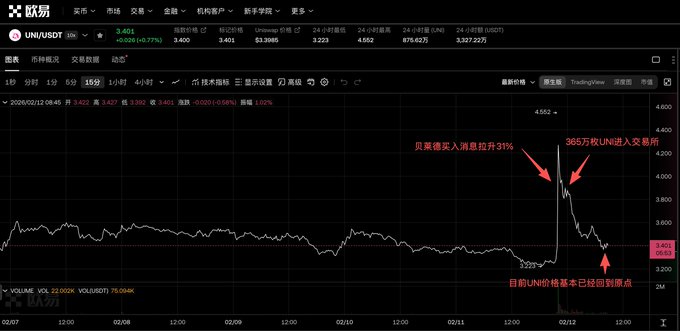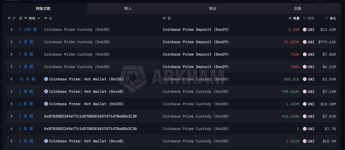 昨天晚上,因贝莱德计划购入一定数量的 $UNI 的消息,UNI 上涨了 31% (从 $3.28 上涨到 $4.3)。 在 UNI 价格上涨之后,一个地址把 365 万枚 $UNI ($1343 万) 转进了 Coinbase Prime。 intel.arkm.com/explorer/addres...… 现在,UNI 价格基本上已经抹去了因为消息带来的全部涨幅,又重新回到了昨天晚上开始上涨时的价格。 #OKX