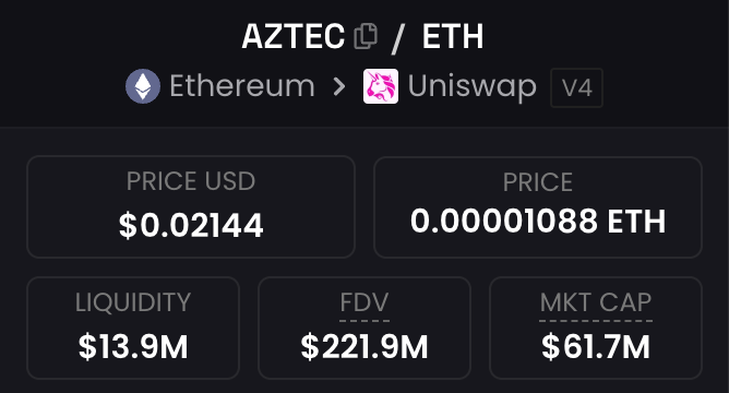 $AZTEC 今天下午 3 点正式 TGE 上线了,价值 $1400 万的流动性池子也同步激活了。 正式上线后,价格较盘前略有上涨。 twitter.com/EmberCN/status/202...