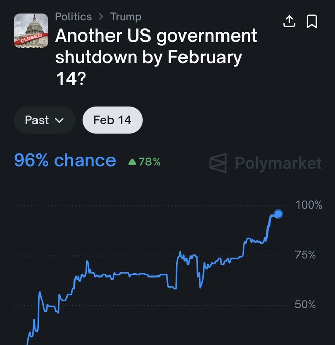 🚨突发:@POLYMARKET 预测周六政府停摆的可能性高达 96%